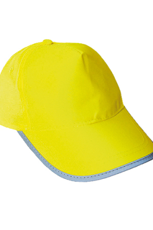 5-Panel-Cap mit bedruckbarer Fläche auf der Stirn, Erwachsenen-Einheitsgröße, verstellbar durch Klettband am Hinterkopf, Vorgeformter Schirm mit reflektierendem Rand, Luftlöcher, Erhältlich in gelb und orange