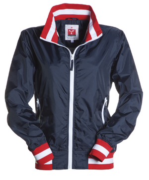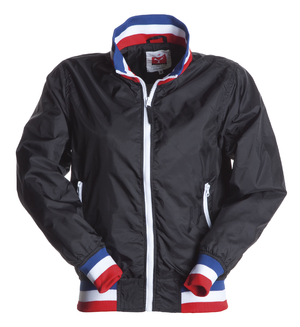 Taillierte Damen Jacke mit Kragen, Ärmel-und Tailenbund aus Ripp-Strickstoff in den drei Farben der Nationalflagge; zwei Seitentaschen, Innenseite nicht gefüttert, 1 Innentasche, 65 g/m²