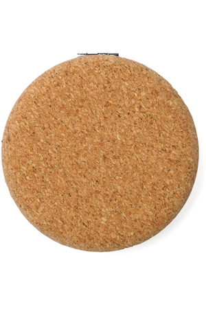 Klappbarer doppelseitiger Taschenspiegel aus Naturkork und verchromtem Metall. 1x / 2x Vergrößerungsspiegel.