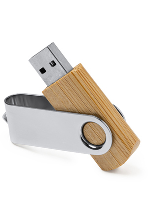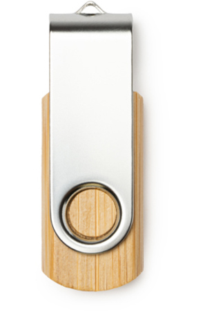 USB-Stick mit natürlichem Bambusgehäuse und Metall-Drehclip. 16 GB Kapazität.
