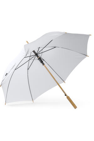 Der Regenschirm mit Bambusgriff, -gestell und -details öffnet sich automatisch und ist aus winddichtem 190T RPET-Pongee-Gewebe. Inklusive passender Hülle, perfekt für stilvollen und nachhaltigen Schutz.