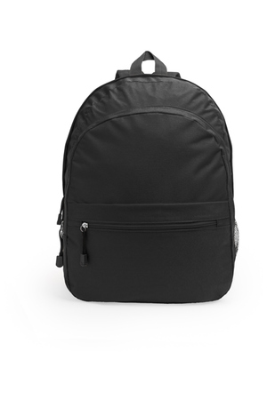 Rucksack aus 600D-Polyester mit zwei Hauptfächern und Fronttasche. Seitliche Netztasche. Gepolsterte Riemen und Rücken.
