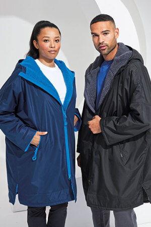 Körper: 100% Polyester – 208 g/m², Futter: Sherpa aus 100% Polyester – 295 g/m², Taschenfutter: Polarfleece aus 100% Polyester – 190 g/m², Tragetasche: 100% Polyester, Vielseitig einsetzbare Jacke, Wasserdichte Außenseite mit Kapuze, Verstellbare Fixiergurte an den Handgelenken, Kinnschutz, Die Innenseite aus kuscheligem Sherpa-Fleece absorbiert Feuchtigkeit und hält warm, Oversize, Ideal zum Wechseln in warme und trockene Kleidung, 2-Wege-Reißverschluss, Mehrere tiefe Taschen innen und außen, Auslieferung mit einer für Rebranding geeigneten Tasche, in der die Jacke verpackt und transportiert werden kann, wenn sie nicht verwendet wird