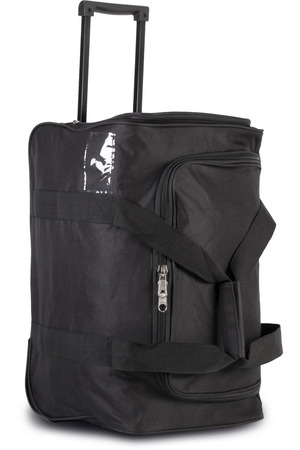 Sporttasche mit Rollsystem, mittelgroß (55 cm), aus 600D-Polyester. Eine RV-Seitentasche für ein Paar Schuhe, große Öffnung mit großem Reißverschluss an der Oberseite, Adressetikett, verstärkte Gurtgriffe mit 5 cm breiten Riemen, die um die Tasche laufen.