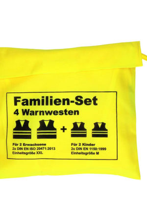Das Familien-Set mit vier Warnwesten, bestehend aus zwei Warnwesten für Erwachsene, Größe XXL (Norm EN ISO 20471:2013+A1:2016) und zwei Warnwesten für Kinder, Größe M (Norm DIN EN 1150:1999-02). Entspricht den Anforderungen der EU-Verordnung 2016/425, Klasse II. Warnwesten- Set aus 2x Warnweste Standard - 09004 und 2x Warnweste Kids - 09053. Im Siebdruck nur in schwarz, silber oder silber reflektierend veredelbar. Warnwesten einzeln im Polybeutel und zusammen im Nylon-Etui verpackt. Aus 100 % Polyester. Maße kombiniert: 250 x 210 x 85 x Ø: 0.