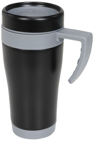 Doppelwandiger Becher mit Schraubdeckel, der mit dem Daumen geöffnet werden kann. Verfügt über einen großen Werbeanbringungsbereich mit einer schwarzen Beschichtung, die dafür sorgt, dass Ihre Gravur auffällt. Fassungsvermögen 400 ml.
